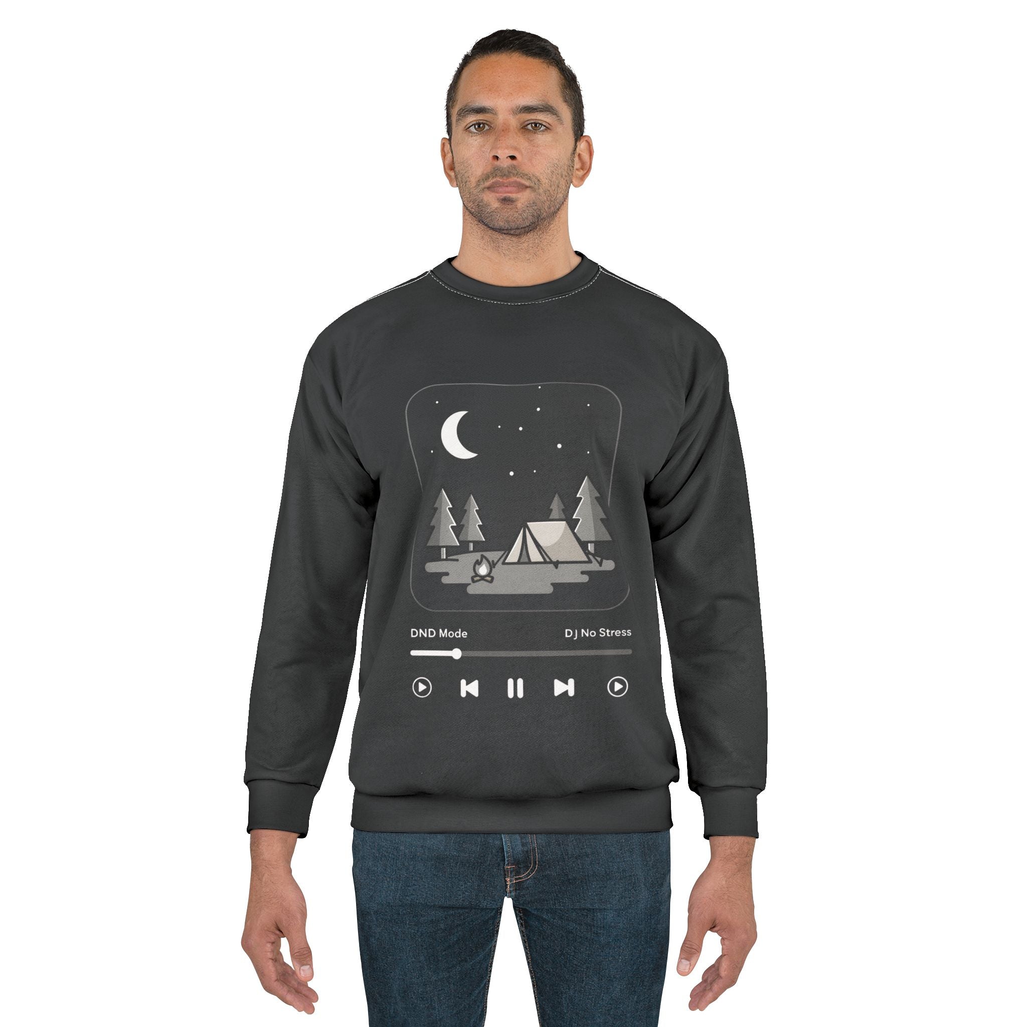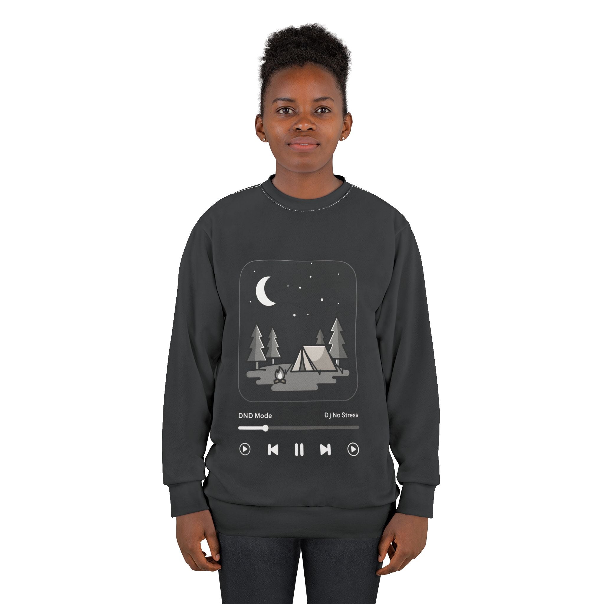 Soft, roomy, and printed edge-to-edge with a moody night-camp illustration, this crew sweatshirt feels like a quiet chorus around the fire. The all-over print shows a small tent, trees, a crescent moon and a minimal music-player bar — a wearable snapshot of late-night drives, starlit playlists, and slow conversations. Medium-weight polyester holds the shape and the design’s contrast, while ribbed cuffs and collar keep the silhouette tidy after repeated wears. Wear it on cool evenings, at campsite mornings, or when you’re curled up with your favorite album — it settles around you like a familiar track.