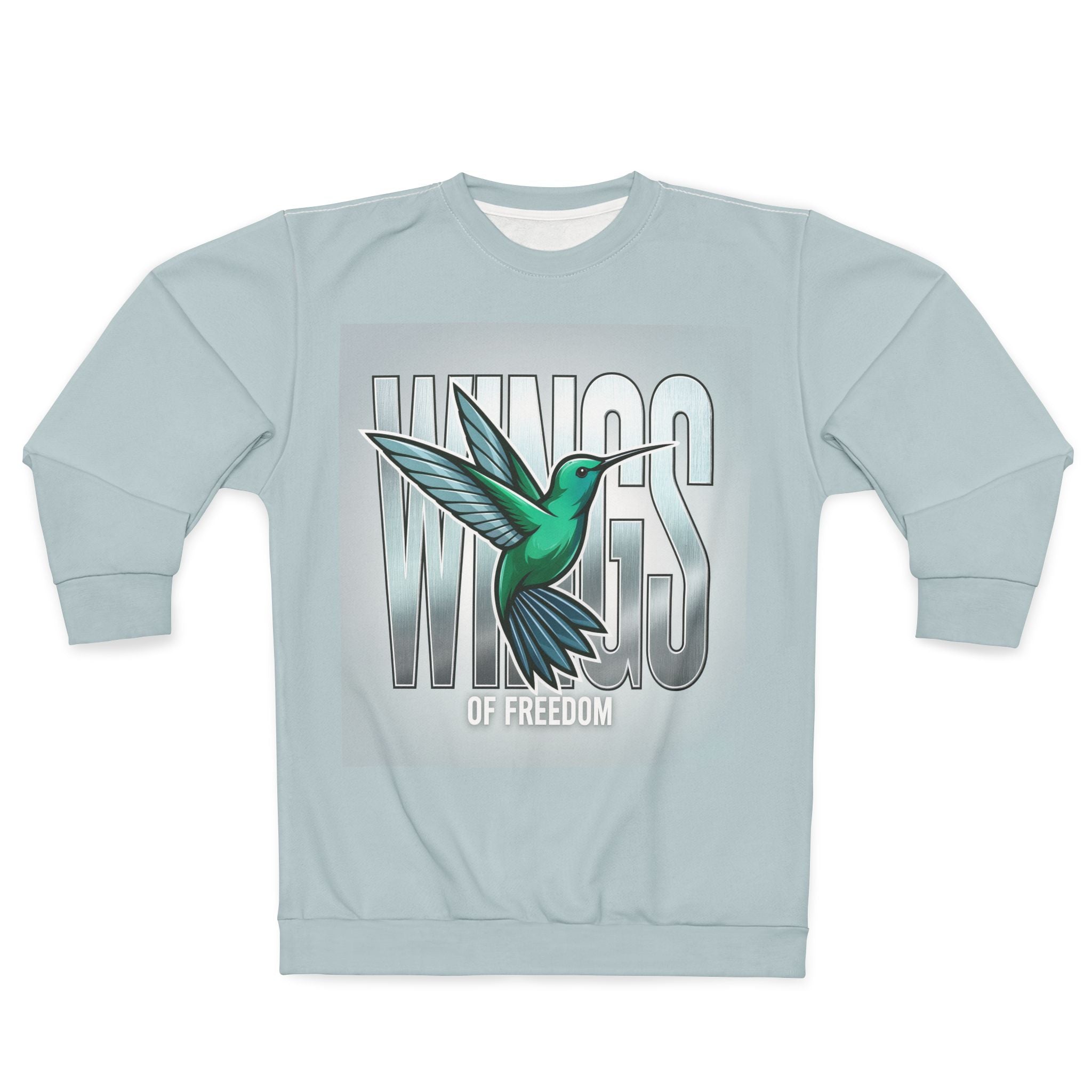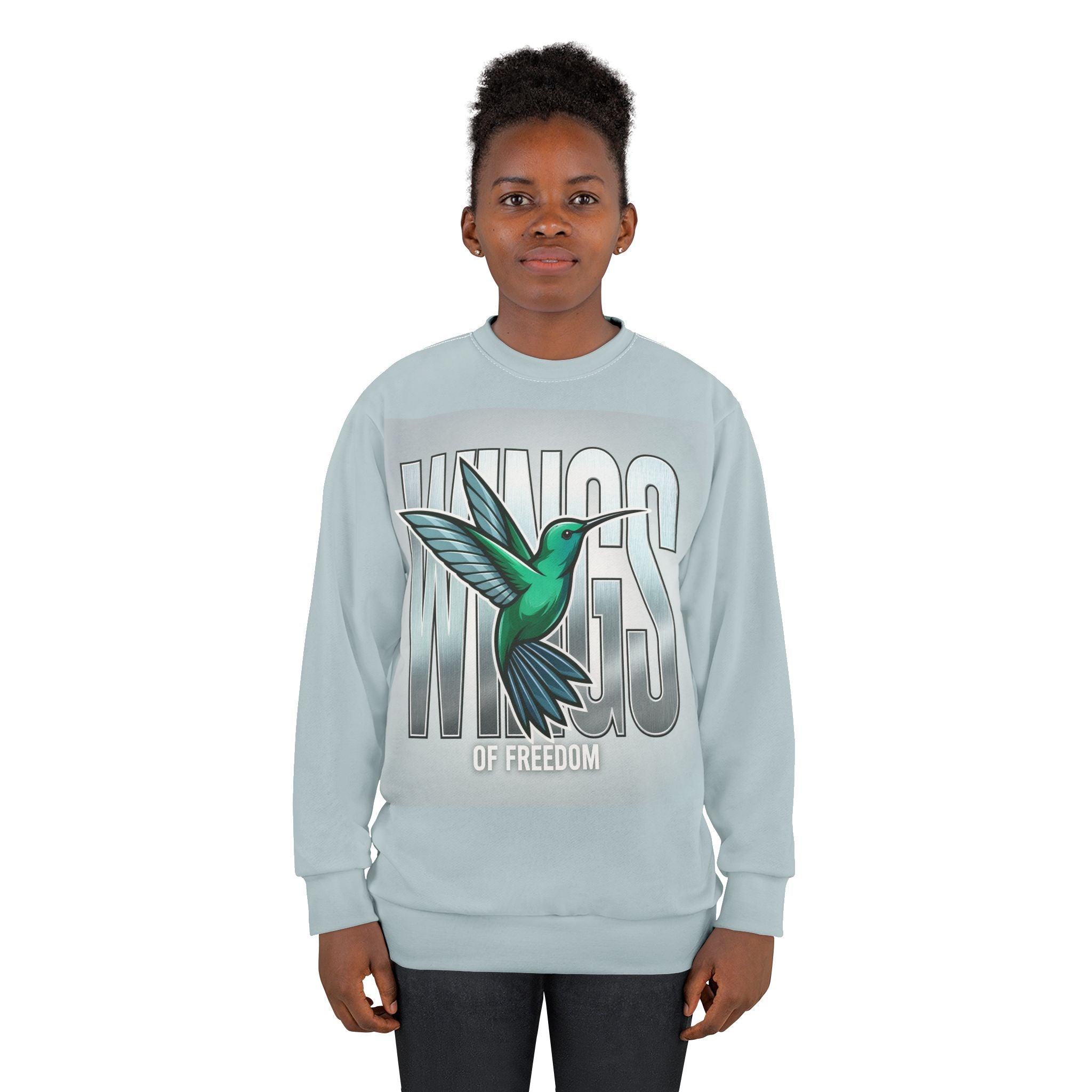 Soft, light-blue sweatshirt printed all over with a bold hummingbird and large, metallic “WINGS” lettering that reads “WINGS of FREEDOM.” It feels calm and slightly nostalgic — like a quiet morning where you watch something small and fierce take flight. The medium-weight polyester holds color brilliantly, so the teal and aqua tones of the bird stay vivid wash after wash. The crew neck and ribbed 1x1 cuffs give a relaxed, lived-in silhouette that layers easily over tees or under a jacket. Wear it when you want an understated statement piece that nods to movement, hope, and quiet resilience.