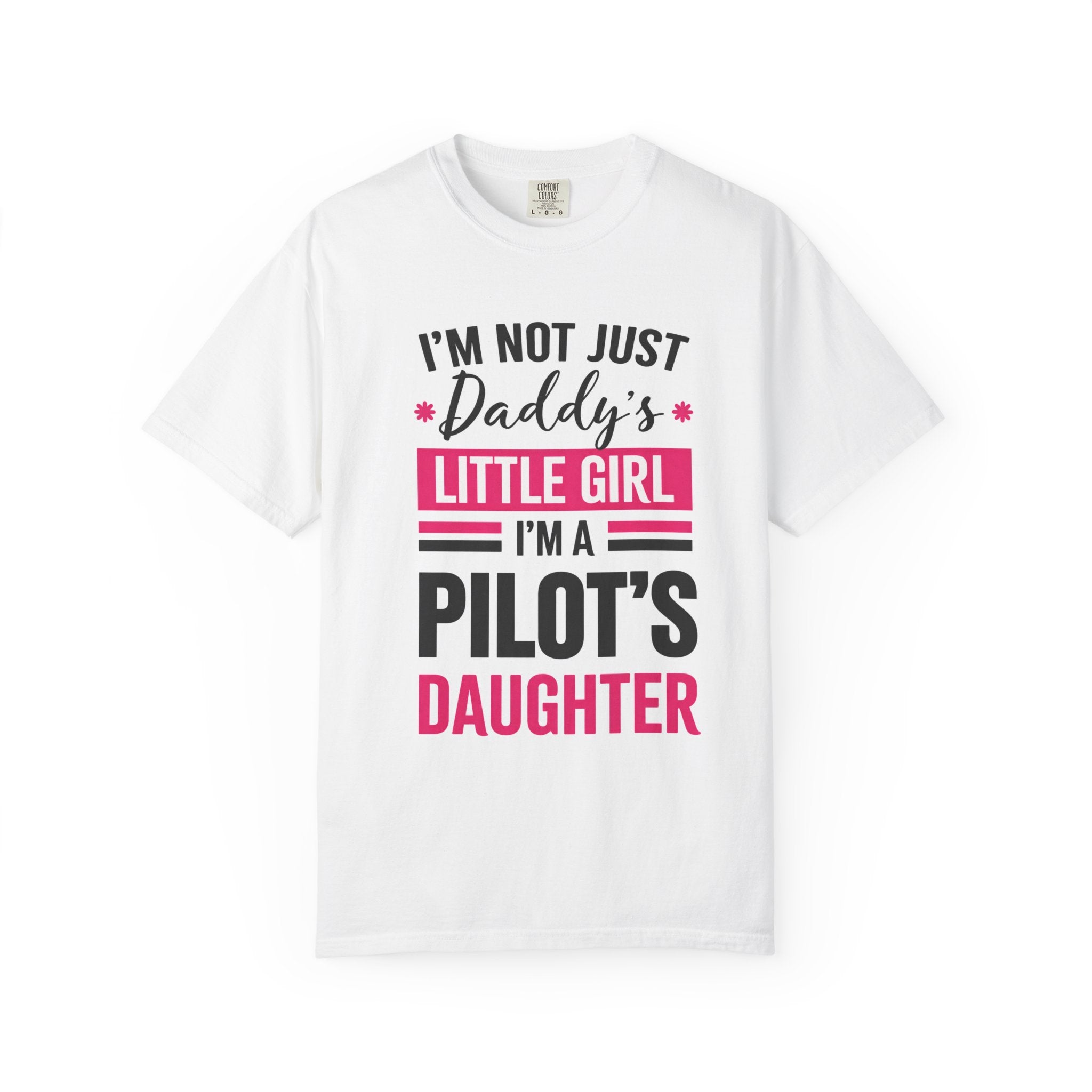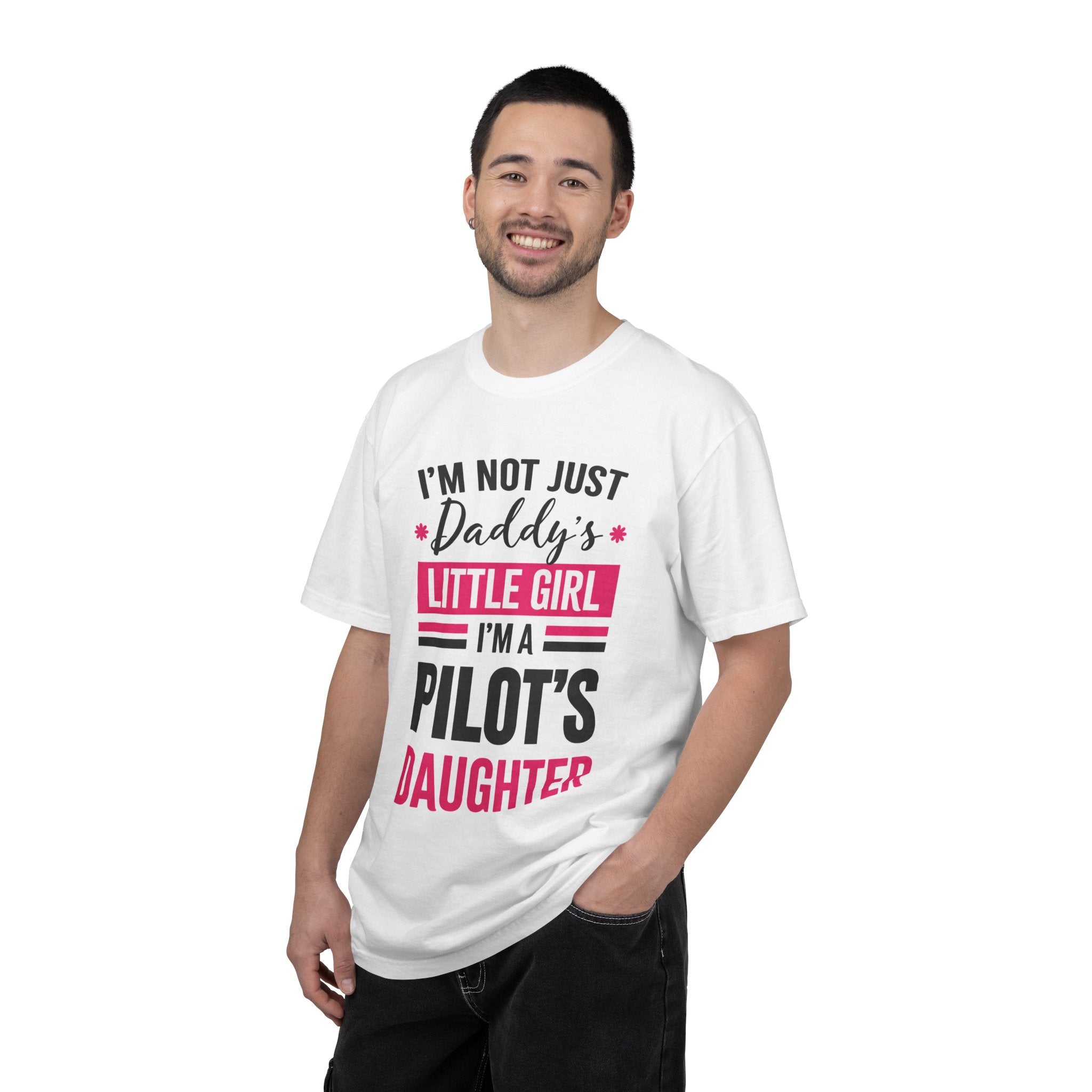 Soft, heavyweight cotton with a lived-in color and a bold, proud message — this tee wears like family. The relaxed fit and garment-dyed finish give it a gentle, broken-in feel from day one, while the graphic (“I’m not just Daddy’s little girl — I’m a pilot’s daughter”) sits front-and-center in confident pink and black. It’s the kind of shirt you pull on for hangarside photos, airport runs, or weekend visits with dad. Durable double-needle seams and a tubular, side-seam-free build mean it keeps its shape through wash after wash. Available in a wide range of colors and sizes, it moves easily from everyday wear to those special moments that celebrate a pilot’s pride and shared adventures.